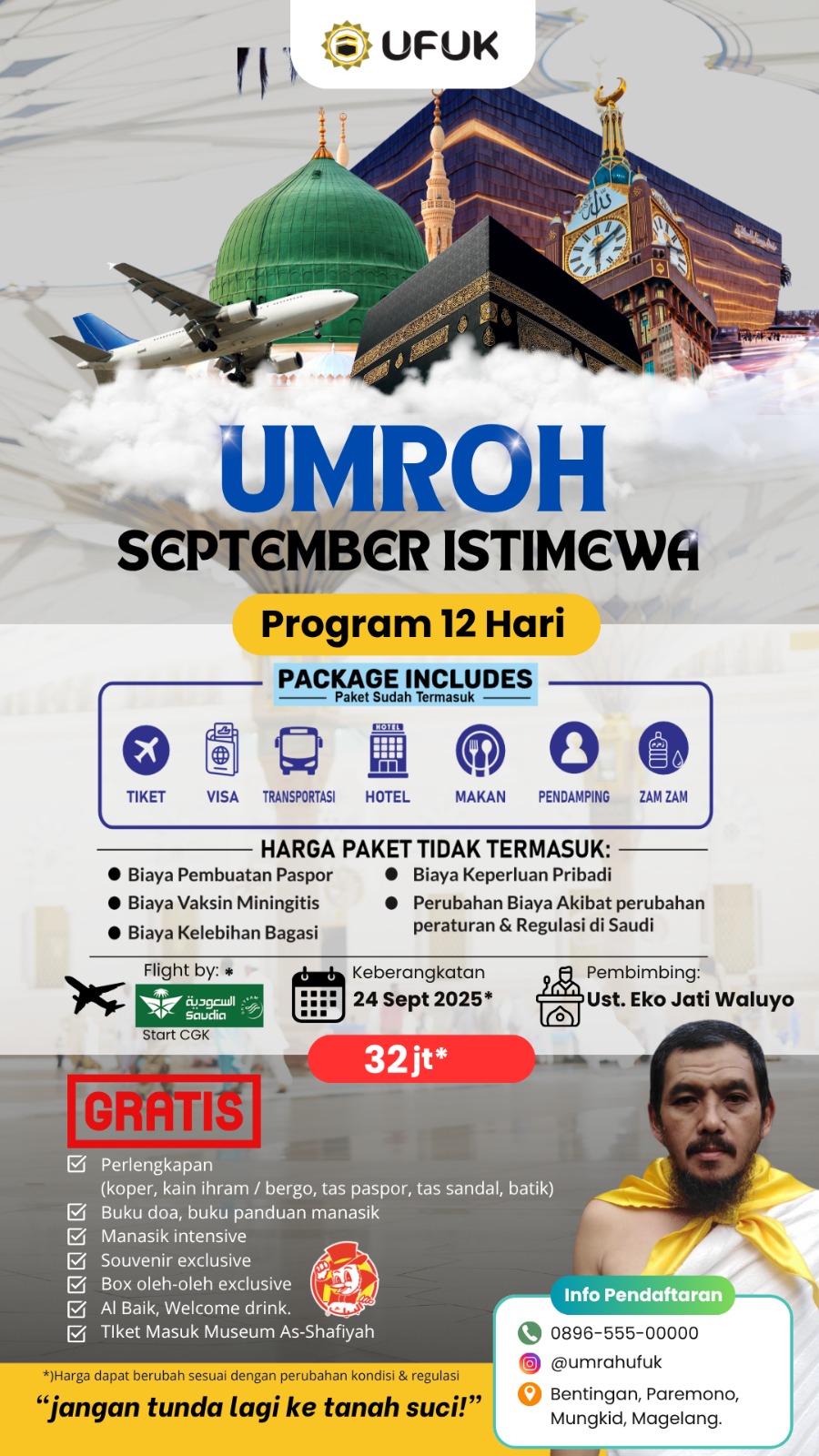 Biaya umroh builan september 2025 keberangkatan dari Magelang adalah 32 Juta rupiah.